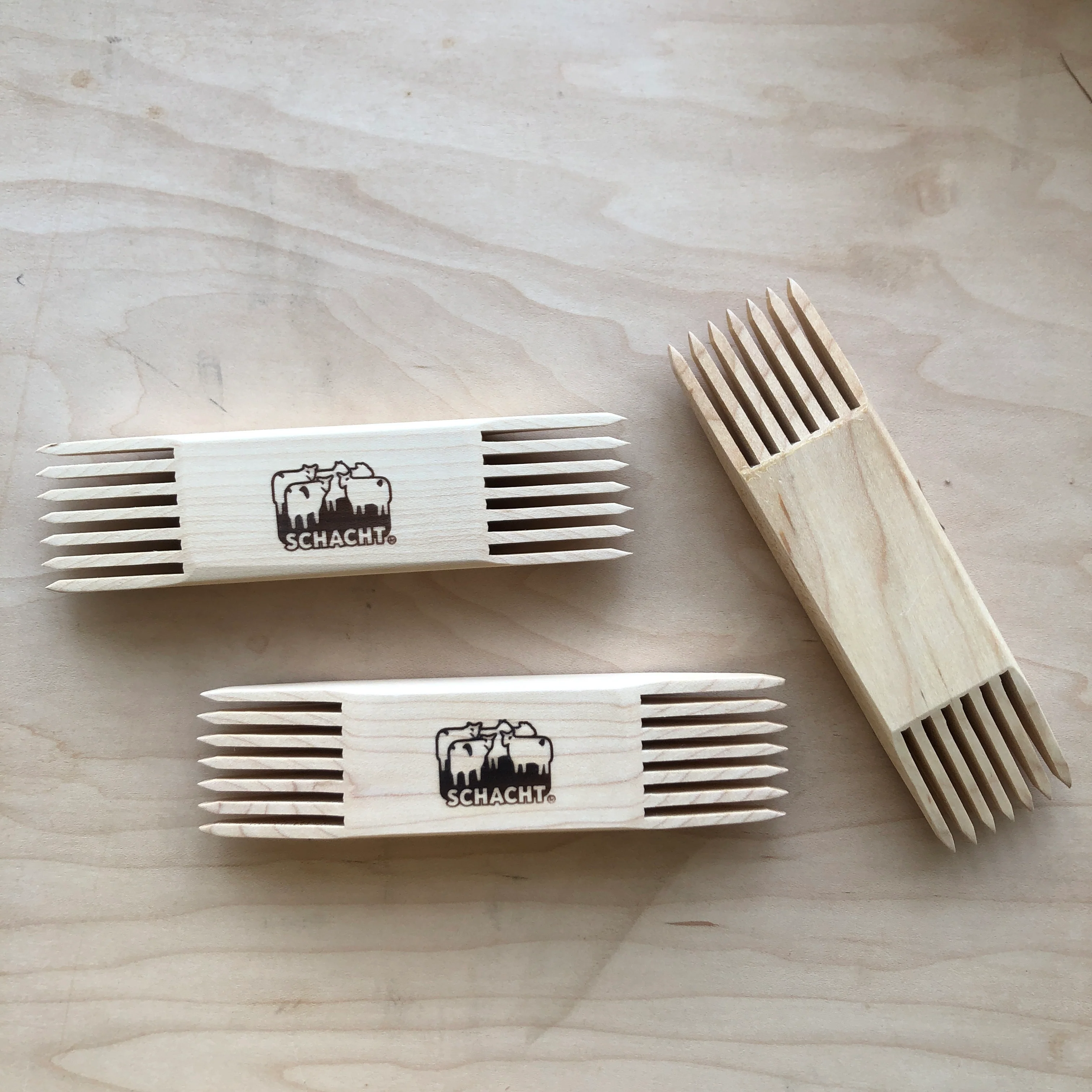 Made of hard maple and have a smooth Danish oil finish. The wooden teeth are set at five per inch.Ā