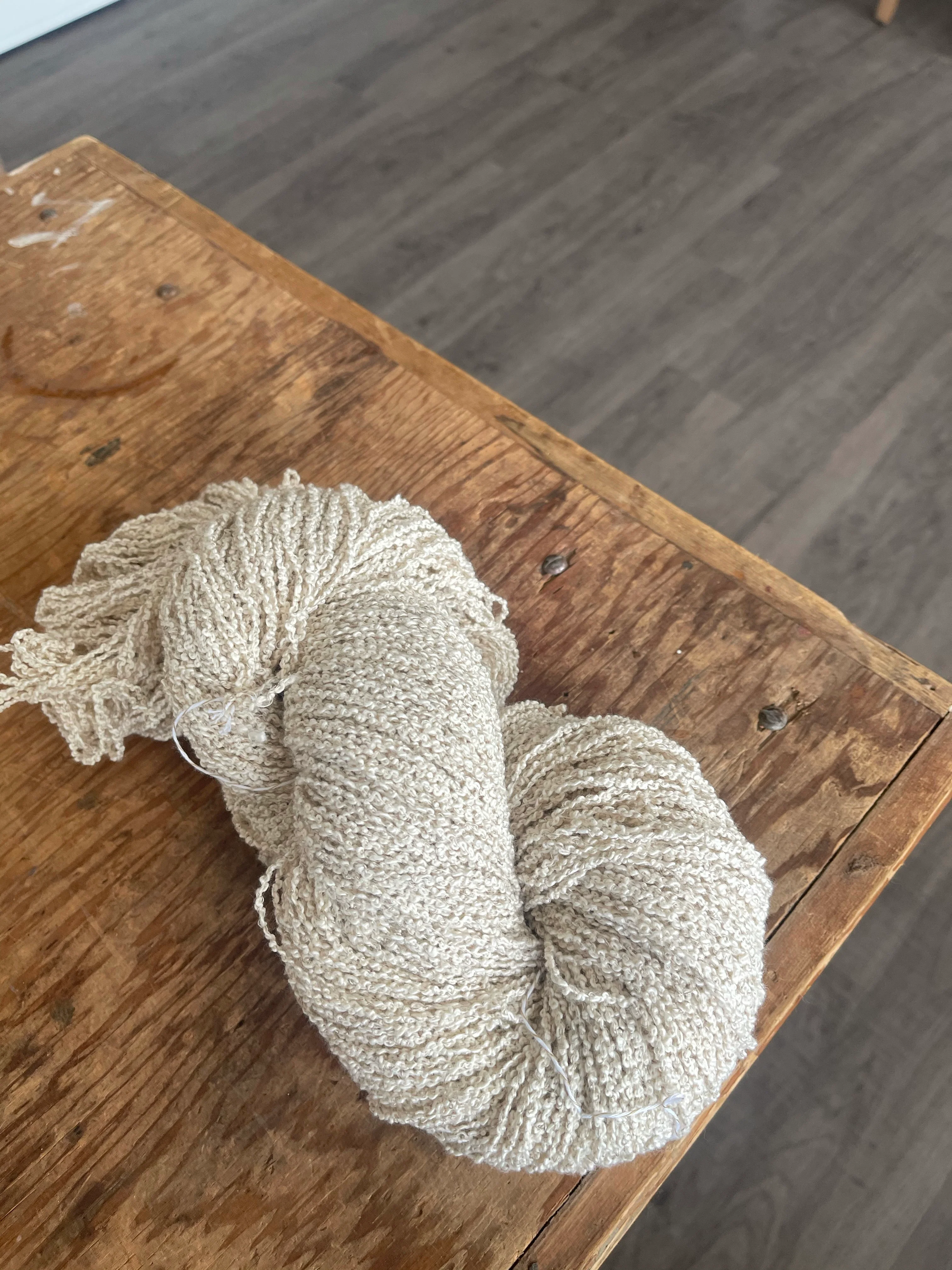 This nubbly, rustic cotton/linen blend has great body and stands up well to wear and tear. Its unique texture makes it ideal for bathroom towels, blankets, rugs, or as an accent weft in wearables. Also an excellent smaller-scale textured yarn for tapestry weaving. Cotton and linen will take up pigment slightly differently, giving dye projects made with this yarn an organic, kettle-dyed look.